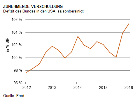 Ein Paradigmenwechsel in der Wirtschaftspolitik liegt in der Luft. Im Augenblick ist die Veränderung erst in Ansätzen zu erkennen. Die Geldpolitik weckt nach wie vor Phantasien. Zuletzt waren es das neue Expansionsprogramm der Bank of England sowie die Zinssenkung in Neuseeland in der vorigen Woche. Es ist aber absehbar, dass die Zinsen nicht unendlich viel weiter negativ werden können. Auch die Anleihekaufprogramme können nicht beliebig ausgeweitet werden. Die Bank of England machte in der vorigen Woche die unerwartete Erfahrung, dass sich eine Reihe von Pensionskassen weigerte, ihr ihre Wertpapierbestände selbst bei hohen Preisen zu verkaufen.Die Finanzpolitik wird aber schon jetzt expansiver. Schauen Sie sich die Grafik an. Sie zeigt, wie die Staatsverschuldung in den USA nach der vorübergehenden Pause in den Jahren 2013 und 2014 wieder deutlich ansteigt. Sie hat sich in den letzten zwölf Monaten von 102 % auf 105 % des BIP ausgeweitet. Das wird sich wohl kaum ändern. Beide Präsi-dentschaftskandidaten haben in ihrem Wahlprogramm eine aktive Finanzpolitik vorgesehen.