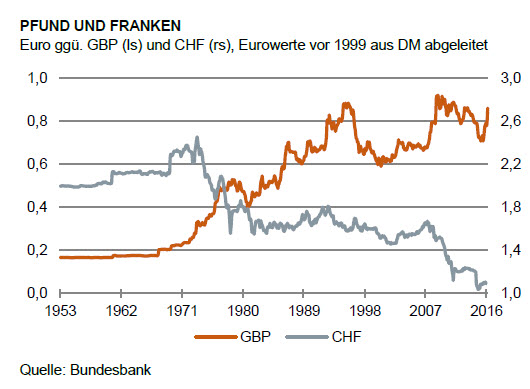 Last but not least hat die Schweiz eine Währung, die tradi-tionell zur Aufwertung neigt. Die Eidgenossenschaft ist für internationale Kapitalbewegungen ein "sicherer Hafen". Das Britische Pfund Sterling war in der Nachkriegszeit lange Zeit eine Abwertungswährung. Erst in den letzten 20 Jahren hat sich die Währung – nicht zuletzt durch die Konkurrenz durch den Euro – auf einem guten Niveau gehalten (siehe Grafik). Damit kann es bald vorbei sein.