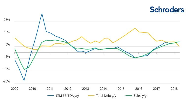 Within investment grade, revenue growth remains positive, but recent results indicate that the pace of growth has moderated as the benefits of US tax reform fade. However, earnings growth continues to outpace debt growth which has led to an organic improvement in leverage metrics (see chart below). This is expected to continue for the next few quarters. Overall, IG corporates are in good shape fundamentally but starting to show signs of late-cycle behavior.