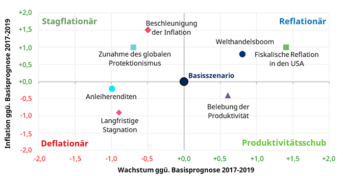 Die oben beschriebenen makroökonomischen Extremrisiken deuten auf ein reflationäres Umfeld hin, in dem die Preissteigerungsraten ansteigen, was sich auch in unseren Szenarioanalysen widerspiegelt. Unsere beiden reflationären Szenarien sind ein „Welthandelsboom” und eine „fiskalische Reflation in den USA”. Der „Welthandelsboom” resultiert in einem kräftigeren Wachstum und einer höheren Inflation, da der Aufschwung die Rohstoffpreise in die Höhe treibt. Das Szenario der „fiskalischen Reflation in den USA” geht jedoch von staatlichen Impulsen aus, die stärkere Steuersenkungen und höhere Infrastrukturinvestitionen umfassen und die Inflation steigen lassen. Beide Szenarien resultieren zwar in einer höheren Inflation. Doch im letzteren Fall konzentriert sich dies auf die USA.