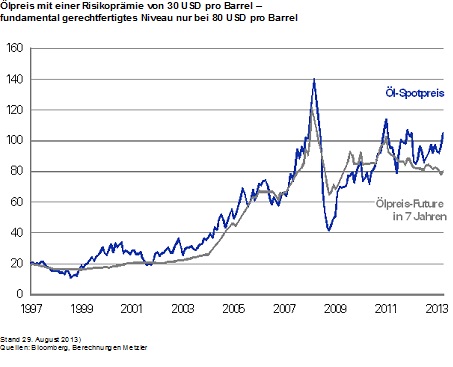 Die tragischen Ereignisse in Syrien und die Risiken eines geopolitischen Flächenbrandes haben deutliche Spuren an den Finanzmärkten hinterlassen. Insbesondere der Ölpreis stieg zuletzt kräftig. Derzeit scheint die Mehrheit der Analysten einen Anstieg des Ölpreises auf 125 USD pro Barrel (WTI) nach einem amerikanischen Militärschlag zu erwarten und bei einer Ausbreitung des Konflikts sogar mit 150 USD pro Barrel zu rechnen. In diesem Umfeld stellt sich die Frage nach der Risikoprämie beim Ölpreis und nach dem fundamental gerechtfertigten Niveau.