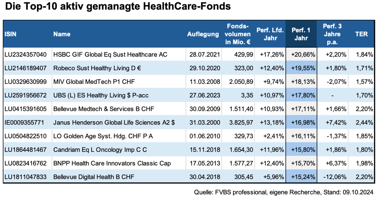 Wie komplex der Bereich Gesundheit tatsächlich ist, lässt sich an den unterschiedlichen Strategien einzelner HealthCare-Fonds ablesen. Vergleicht man zum Beispiel aus dem Top-10-Ranking der performancestärksten aktiv gemanagten Produkte den ersten und den zehntplatzierten Fonds der Ein-Jahres-Wertung, fällt auf, dass der HSBC GIF Global Equity Sustainable Healthcare AC sowohl seit Jahresbeginn als auch über den Zeitraum der vergangenen drei Jahre hinweg deutlich besser performt hat als der Bellevue Digital Health B CHF. Dieser hat auf Dreijahressicht sogar über zwölf Prozent Wertverlust zu beklagen.