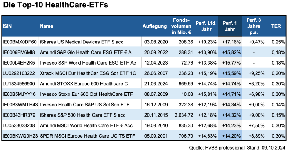 Auch bei den Gesundheits-ETFs sind Performance-Differenzen erkennbar. Diese sind allerdings nicht so groß wie bei den aktiv gemanagten Fonds. Es macht zwar zum Beispiel schon einen Unterschied, ob der Kurs eines ETFs innerhalb eines Jahres 17 Prozent zulegt – oder nur 14 Prozent. Wenn dieselben beiden Fonds im Performancevergleich im laufenden Jahr jedoch eine zueinander genau umgekehrte Entwicklung aufweisen, wie es beim iShares US Medical Devices ETF und dem SPDR MSCI Europe Health Care UCITS ETF der Fall ist, gleichen sich diese Effekte wieder aus.