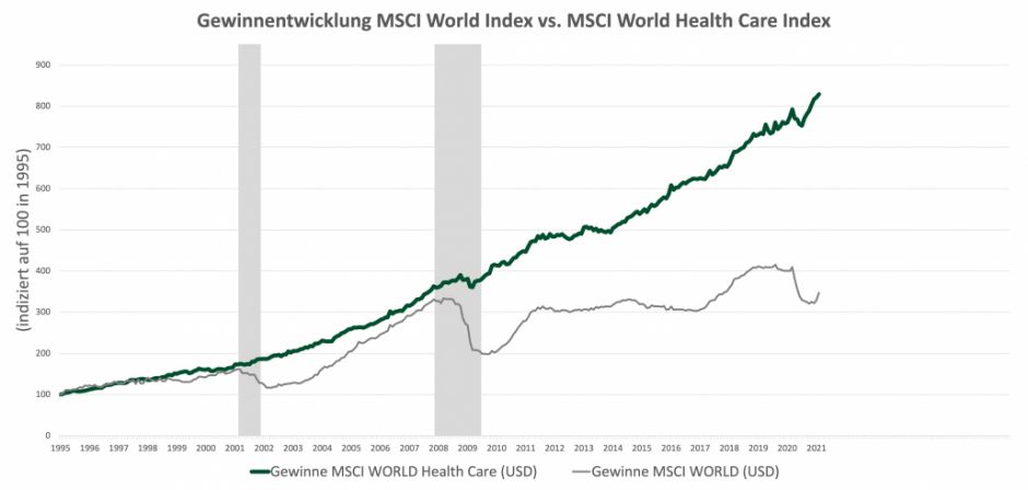 Damit setzt sich die Gewinnentwicklung der Unternehmen des Gesundheitssektors weiter vom allgemeinen Markttrend ab, wie die nachfolgende Grafik eindrucksvoll belegt.