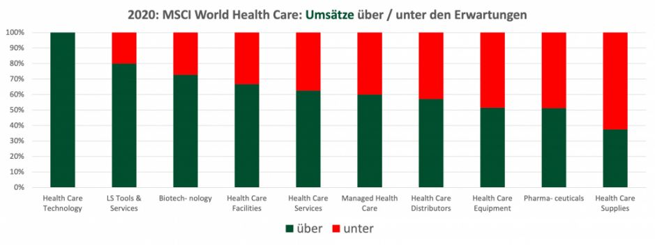 Alle Unternehmen des Technologiesubsektors (Health Care Technology) konnten die Umsatzerwartungen übertreffen, gefolgt von den biomedizinischen Zulieferern (Life Sciences Tools & Services) mit 80% und der Biotechnology bei der 73% der Unternehmen einen im Vergleich zum Konsensus höheren Umsatz berichten konnten. Hinten an lagen die Medizintechnik (Health Care Equipment), die Pharmazeutische Industrie und die Hersteller von medizinischen Verbrauchsmaterialien (Health Care Supplies). Die gegenüber den Schätzungen niedrigeren Umsätze der Medizintechnik und der medizinischen Zulieferer sind stellenweise in der im Winter erneut einsetzenden Pandemiewelle begründet.