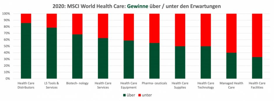 Bei den Gewinnerwartungen konnten fast alle Pharmagrosshändler (Health Care Distributors) die gesteckten Ziele übertreffen. Auch ca. 80% der Unternehmen aus der biomedizinischen Zulieferindustrie übererfüllten die Erwartungen, gefolgt von der Biotechnologie mit 68%. Trotz des starken Umsatzwachstums lagen die Technologieanbieter des Gesundheitssektors auf den hinteren Plätzen, zusammen mit den Krankenversicherungsunternehmen und den Betreibern von Krankenhäusern und Pflegeeinrichtungen (Health Care Facilities).