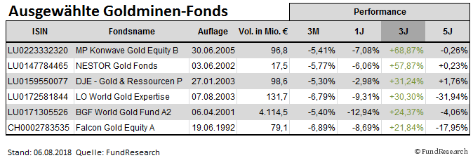Es gibt auch eine Möglichkeit, von steigenden Goldpreisen zu profitieren, die im Fall des Falles ertragreicher, aber bei weiter fallenden Goldpreisen auch mit entsprechenden Risiken verbunden ist: der Kauf von Goldminen-Fonds, die das Anlegerkapital in Goldminen investieren und sich auch an Unternehmen beteiligen, die ihr Geld mit der Lagerung und Weiterverarbeitung von Gold verdienen. Bei Goldminenaktien wirkt, anders als bei physischem Gold, ein starker Hebel.