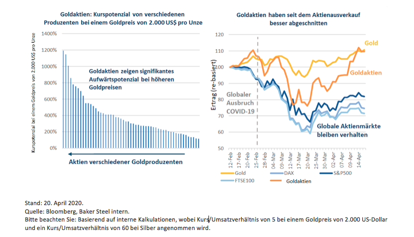 Die Spanne zwischen Goldaktien und dem Goldpreis hat ein extremes Niveau erreicht, wobei die Aktienkurse der Goldproduzenten weitgehend immer noch die gleichen waren wie zu dem Zeitpunkt, als der Goldpreis lediglich 1.400 USD / Unze betrug. Wir sehen eine Chance für Investoren, da dieser noch recht günstige Sektor in den kommenden Monaten mit hoher Wahrscheinlichkeit neu bewertet wird. Die Goldminenbranche ist im Großen und Ganzen in guter finanzieller Verfassung, was bedeutet, dass eine Auswahl von Goldunternehmen nicht nur die COVID-19-Krise überstehen wird, sondern auch erheblich von der Margenausweitung und der genannten möglichen Neubewertung profitieren wird.