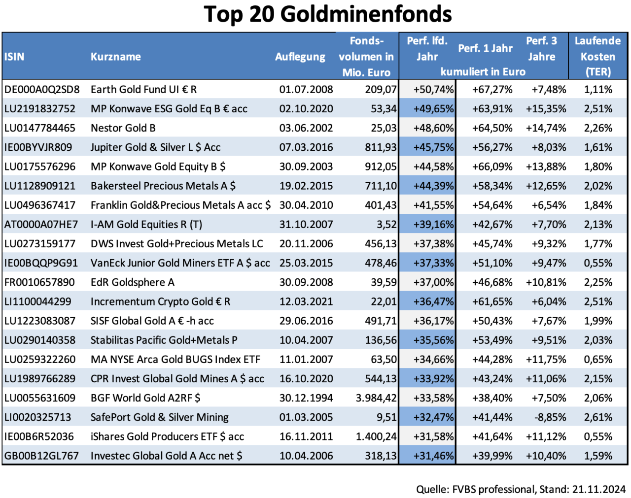 Um von einem weiteren Anstieg des Goldpreises zu profitieren zu können, haben Anleger die Wahl zwischen Gold-ETCs und Goldminenfonds. Während die ETCs direkt in Gold investieren und ihr Wert somit mehr oder weniger im Gleichtakt zum Goldpreis mitschwingt, bieten Goldminenfonds die Gelegenheit, in Minengesellschaften zu investieren. Hier müssen die Fondsmanager ihr Können unter Beweis stellen, indem sie jeweils für ihren Fonds die Unternehmen mit den niedrigsten Förder- und Vertriebskosten herausfiltern und ins Portfolio nehmen. Gold auf dem Gestein zu schürfen, ist ein aufwändiges, energieintensives Unterfangen. Die Kostensteuerung in diesem Bereich ist deshalb ein Schüsselsegment für die Ertragskraft eines Unternehmens. Die Förderkosten pro Tonne definiert die Gewinnmarge. Sie ist umso höher, je höher der Goldpreis steigt. Ein Unternehmen, das beispielsweise 1.000 Dollar pro Feinunze an Gesamtförderkosten hat, hatte bei einem Goldpreis von 2.000 Dollar – dem Preis Mitte Februar 2024 – einen Gewinn von 1.000 US-Dollar pro Feinunze erzielt. Der Goldpreis ist seitdem um 33 Prozent gestiegen. Ein Unternehmen mit den hier beispielhaft genannten Förderkosten verdient nun rund 1.670 US-Dollar pro Feinunze – also rund 67 Prozent mehr als im Februar. Das Rechenbeispiel macht deutlich, welche Hebelwirkung der Goldpreis auf die Ertragskraft von Goldminengesellschaften hat – und damit auch auf deren Aktienkurs. Goldminenfonds oder ETFs, die hier die besten Perlen aus der Vielzahl der Gesellschaften in ihrem Portfolio vereint haben, können ihren Anlegern also viel Freude bereiten.