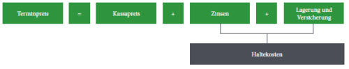 Der Terminpreis hingegen ergibt sich aus dem Wert des Basiswerts, das heißt effektiv, dem Kassapreis, zuzüglich der Haltekosten (costof carry), die sich aus Zinsen sowie Lager- und Versicherungskosten zusammensetzen. Die Lieferung des physischen Golds kommt bei Kleinanlegern und selbst bei institutionellen Anlegern wegen der Haltekosten nur selten vor.
