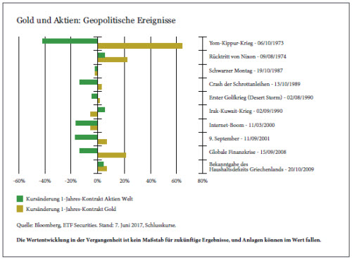 Der Goldpreis steigt möglicherweise aber auch dann, wenn sich die Stimmung auf dem Markt verschlechtert, sodass Gold, das in der Vergangenheit nicht mit anderen Vermögenswerten korrelierte, der Portfoliodiversifizierung dient. Wenn ferner die Welt etwas bedrohlicher, unruhiger oder gefährlicher wahrgenommen wird (siehe Nordkorea), ist Gold häufig der sichere Hafen, in dem man Zuflucht sucht.