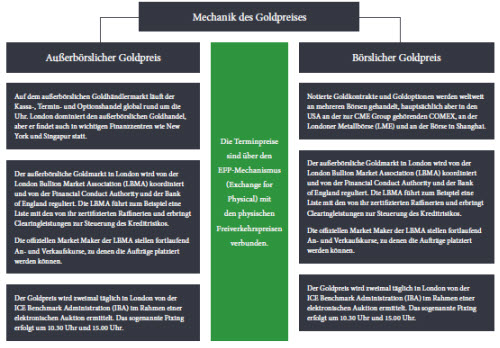 Die meisten Anleger kommen in der Regel nur dann mit Gold in Berührung, wenn sie Gold-Exchange Traded Products (ETPs) oder Goldmünzen halten. Der Goldmarkt beruht insgesamt auf einem umfangreichen Händlermarkt, auf dem in erster Linie die vielfältigen Finanzinstitute, Goldminen,Raffinerien und anderen Goldabnehmer für die