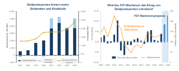Neben den niedrigen Bewertungen und der Ausweitung der Gewinnspannen gibt es einen weiteren Vorteil für Investoren: Goldminenunternehmen schütten immer mehr Gewinne an ihre Aktionäre aus. Starke Goldpreise und stabiler freier Cashflow ermöglichen steigende Dividenden und Aktienrückkäufe. Newmont Mining hat sein Aktienrückkauf-Programm auf drei Milliarden US-Dollar ausgeweitet, Barrick Gold auf eine Milliarde US-Dollar, und Kinross Gold sowie B2 Gold erwägen die Wiederaufnahme von Rückkäufen.