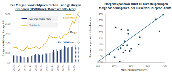 Dabei ist das Aufwärtspotenzial der Aktien beträchtlich, da die Minengesellschaften noch nicht die Performance früherer Goldzyklen erreicht haben. In der Vergangenheit erzielten Bergbauunternehmen bei Goldpreiserholungen eine 2-5-fache Hebelwirkung, während die aktuelle Performance weitgehend der des physischen Metalls entspricht.