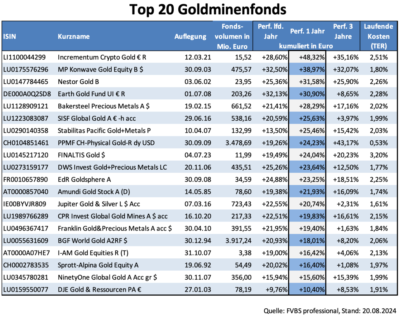 Noch spiegelt sich diese enorme Hebelwirkung kaum in den Performancedaten der Minenfonds wider. Das liegt daran, dass die Minengesellschaften ihre erwarteten Fördermengen frühzeitig über den Terminmarkt verkaufen. Die Gewinnmargen springen also erst mit einiger Zeitverzögerung an. Die Kurse der Unternehmen steigen erst dann, wenn die Mehrzahl der Marktteilnehmer einen längerfristigen Trend zu höheren Goldpreisen erkennt und erwartet, dass die Minengesellschaften an den Terminbörsen auch langfristig höhere Gewinne erzielen. Dieser Effekt lässt sich an den Kursen der Goldminenfonds derzeit gut ablesen. Der erfolgreichste Fonds, der Incrementum Crypto Gold hat es als einziger Fonds in den vergangenen zwölf Monaten geschafft, einen höheren Wertzuwachs zu erzielen als Gold selbst. Das liegt wohlgemerkt nicht an einem feineren Gespür der Fondsmanager beim Auffinden ertragreicher Minengesellschaften, sondern einfach daran, dass der Fonds fast ein Drittel des Fondsvermögens in Kryptowährungen investiert – und dies offensichtlich mit Erfolg.