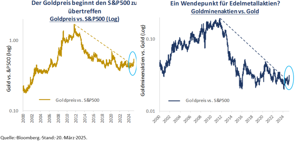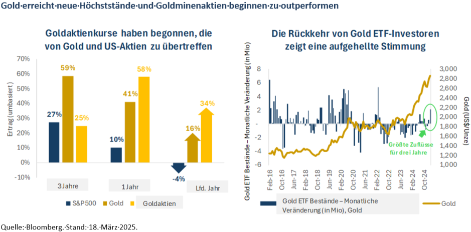 Die Stärke und das Tempo der Hausse bei Gold haben viele Marktbeobachter überrascht, und die wichtigsten Faktoren deuten darauf hin, dass der Markt auf diesen Niveaus gut unterstützt ist. Die jüngsten neuen Höchststände wurden durch die starke physische Nachfrage nach Gold von einer Reihe von Anlegern angetrieben. Von Zentralbanken, die ihre Goldreserven aufstocken, über Institutionen, die eine Diversifizierung anstreben, bis hin zu Privatanlegern, die einen sicheren Hafen suchen, nimmt die Bedeutung von Gold unter den aktuellen makroökonomischen Bedingungen weiter zu. Die börsengehandelten Goldfonds verzeichneten im Februar die größten monatlichen Zuflüsse seit drei Jahren, was auf einen Stimmungsumschwung der Anleger gegenüber dem Goldsektor hindeutet. Gold hat sich im vergangenen Jahr besser entwickelt als der S&P500, und auch die Minenwerte haben begonnen, sich besser zu entwickeln als physisches Gold. Wir glauben, dass ein Wendepunkt erreicht ist und dass die derzeitige Kapitalrotation dazu führen wird, dass die Edelmetallminenunternehmen weiterhin eine Hebelwirkung auf den Goldpreis ausüben, wenn dieser weiter steigt.