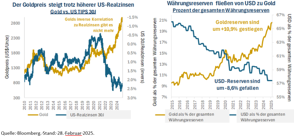 Hinter dieser Entwicklung verbirgt sich ein grundlegender Wandel in der Rolle von Gold und anderen Sachwerten für Anleger und politische Entscheidungsträger im Vergleich zum US-Dollar und zu US-Vermögenswerten. Erstens ist eine Entdollarisierung in den Ländern im Gange, vor allem in den BRICS-Ländern, wobei China seine US-Schatzbestände in den letzten zehn Jahren um 38% reduziert hativ. Die Streichung der US-Schatzbestände Russlands nach der Invasion in der Ukraine hat diesen Trend noch beschleunigt. Unterdessen häufen viele Länder weiterhin Goldreserven an. Wie das obige Schaubild zeigt, ist der Anteil der US-Dollar-Reserven an den gesamten Devisenreserven in den letzten zehn Jahren um 8,6% gesunken, während der Anteil des Goldes um 10,9% gestiegen istv. Zweitens sind die USA selbst mit Risiken für ihre Finanzlage konfrontiert, was die Nachfrage nach Gold als sicherem Hafen ankurbeln dürfte. Der US-Dollar tendiert seit Trumps Amtsantritt inmitten erneuter Sorgen über eine Verlangsamung des Wachstums und eine mögliche Stagflation angesichts der anhaltenden Inflation nach unten. Die Aussicht auf weitere Zinssenkungen in den USA hat sich zwar abgeschwächt, doch halten wir Zinserhöhungen nach wie vor für unwahrscheinlich. In der Zwischenzeit dürfte sich das Defizit weiter ausweiten. Das Anfang März verabschiedete US-Ausgabengesetz sah Steuersenkungen in Höhe von 4,5 Billionen USD und Ausgabenkürzungen in Höhe von nur 2 Billionen USD vor, wodurch die Staatsverschuldung um 2,5 Billionen USD anstiegvi. Trotz der Bemühungen des neuen Department of Government Efficiency (DOGE) steigt die Verschuldung der USA weiter an, so dass die Schuldenlast bis 2025 auf über 1 Billion USD ansteigen wirdvii, was das Risiko für Gold nach oben verschiebt.