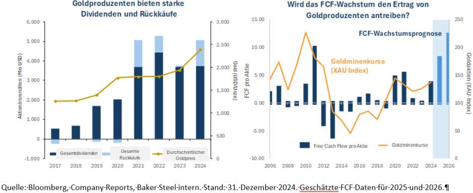 Dennoch sind wir der Meinung, dass Goldminenunternehmen für Anleger zunehmend attraktiv erscheinen. Neben den niedrigen Bewertungen und der Ausweitung der Gewinnspannen sehen wir auch, dass Goldminenunternehmen mehr Kapital an ihre Aktionäre zurückgeben, was durch die starken Goldpreise und den robusten freien Cashflow unterstützt wird. Die Dividenden steigen im Einklang mit der bestehenden Politik, auch wenn einige Unternehmen beginnen, ihre Ausschüttungspläne zu überarbeiten, um flexibler zu sein. Aktienrückkäufe werden immer beliebter, um überschüssige Barmittel zurückzugeben. So hat Newmont Mining sein Programm auf 3 Mrd. USD ausgeweitet, Barrick Gold erhöht es auf 1 Mrd. USD, und Kinross Gold und B2 Gold erwägen die Wiederaufnahme von Rückkäufenxiv.