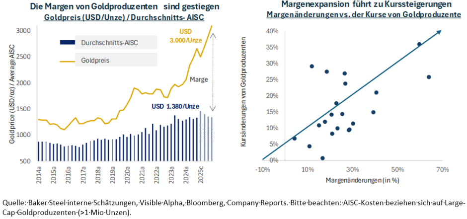 Die jüngsten Kursgewinne des Goldes bieten Edelmetallminenunternehmen eine neue Chance. Viele von ihnen stehen vor einem Rentabilitätsschub, der die Stimmung der Anleger gegenüber diesem oft übersehenen Sektor verbessern dürfte. In den letzten Jahren waren Edelmetallaktien extrem unterbewertet: Das KGV von Goldminen ist seit den Höchstständen im Jahr 2020 um 46 % gesunkenxi, und Goldaktien werden mit einem EV/EBITDA von nur 5,0 gehandelt, während Technologieaktien mit dem 18,9-fachen bewertet werdenxii. Diese Unterbewertung ist besonders deutlich, wenn man bedenkt, dass die Fundamentaldaten für Edelmetallminenunternehmen immer besser werden. Die Ergebnisse des vierten Quartals 2024 waren ermutigend, da viele Unternehmen Produktionswachstum und Kostenkontrolle nachweisen konnten. Bei durchschnittlichen nachhaltigen Gesamtkosten (AISC) von rund 1.380 USD/Unze erhalten die Bergbauunternehmen eine beträchtliche Marge, wie aus der nachstehenden Grafik hervorgeht, während die konservative Planung der Erzreserven eine gute Disziplin erkennen lässt. Wir sehen eine eindeutige positive Korrelation zwischen der Margenausweitung eines Minenunternehmens und der Neubewertung seines Aktienkurses, wie aus dem nachstehenden Diagramm hervorgeht.