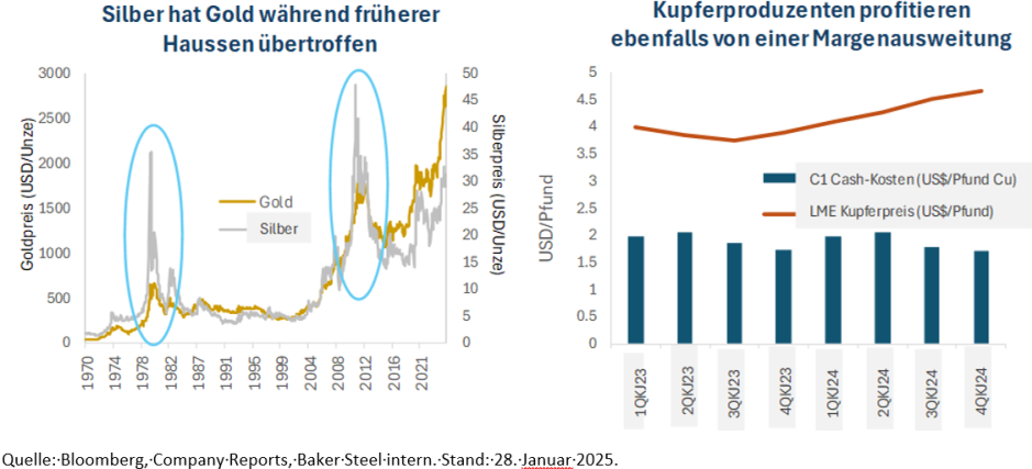 Neben der steigenden Nachfrage nach Gold sehen wir derzeit Chancen bei einer Reihe von Metallen. Während die kurzfristige Volatilität aufgrund industrieller Faktoren anhalten könnte, sind Kupfer- und Silberminen besonders gut für eine mittelfristige Outperformance positioniert. Beginnen wir mit Silber: Das Metall liegt seit einiger Zeit hinter Gold zurück, weist aber weiterhin ein hohes Beta gegenüber den Bewegungen des Goldpreises auf. Der Silbermarkt weist seit 2021 ein strukturelles Defizit auf, das im Jahr 2025 schätzungsweise 149 Mio. betragen wirdxvii. Die Investitionsnachfrage war in den letzten Jahren schwach, wobei Silber ähnlich wie Gold mit einem mangelnden Interesse westlicher Investoren zu kämpfen hat. Der Unterschied bei Silber besteht darin, dass die industrielle Nutzung mehr als 50 % der Nachfrage ausmacht und schnell wächst. Die steigende Nachfrage nach Solarenergie und Elektronik ist eine wichtige Triebkraft für den Silberpreis und für die Silberminenbetreiber. Es wird prognostiziert, dass bis 2030 allein die Nachfrage nach Silber aus der Solarpanelproduktion rund 29 % des jährlichen Silberangebots ausmachen wird, verglichen mit rund 23 % im Jahr 2024xviii. Unserer Ansicht nach wird die Bedeutung von Silber in der Technologie oft übersehen, und wir betrachten Silber als den „unbesungenen Helden“ der neuen industriellen Revolution.