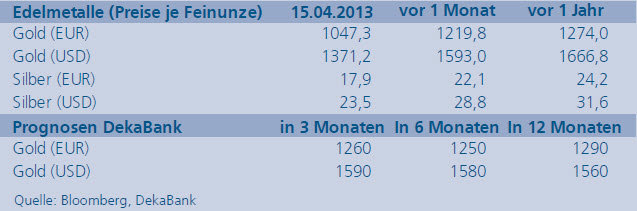 Der Goldpreis befindet sich im freien Fall. Innerhalb weniger Tage stürzte er von 1.600 US-Dollar je Feinunze auf unter 1.400 US-Dollar – den tiefsten seit über zwei Jahren – ab. „Neben schwächeren Konjunkturdaten belastete zunächst vor allem das Gerücht über mögliche Goldverkäufe der zyprischen Nationalbank den Preis – auch wenn deren Anteil an den globalen Goldreserven mit 0,05 Prozent sehr gering ist“, erläutert Dr. Bastian Hepperle vom Macro-Research-Team der DekaBank. Das einst so beliebte Edelmetall werde derzeit immer seltener als sicherer Hafen nachgefragt. „Die Gold-Exchange Traded Funds verzeichnen weiterhin kräftige Abflüsse und an den Terminmärkten schätzen die spekulativen Finanzinvestoren die künftige Preisentwicklung skeptisch ein“, analysiert der Experte die Gründe, weshalb er eine starke Aufwärtsentwicklung auch vorerst nicht erwartet. Dennoch bestehe kein Grund zur Panik: „Gleichwohl halten wir den Preissturz von Mitte April für überzogen und erwarten, dass sich dieser wieder weitgehend zurückbilden wird.“