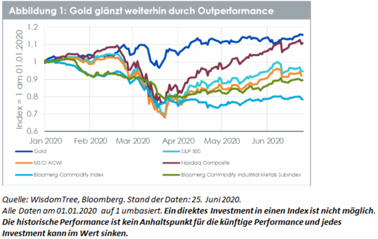 Gold, das zum Wochenende bei rund 1.800 Dollar je Feinunze notierte, ist der einzige wichtige Rohstoff, der seit Jahresbeginn in der ersten Jahreshälfte 2020 Zuwächse verbuchen konnte, erklärt WisdomTree in einer aktuellen Studie zu dem gelben Edelmetall. Durch die COVID-19-Krise seien die Pläne für 2020 vollkommen aus den Fugen geraten. Beispielsweise hat der Internationale Währungsfonds zu Beginn des Jahres noch ein BIP-Wachstum von 3,3 Prozent, so der Vermögensverwalter. Diese Vorhersage sei auf -4,9 Prozent nach unten korrigiert worden.