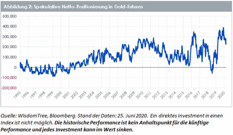 Bei der Suche nach einer Antwort beschäftigt sich WisdomTree zunächst damit, wie die Anleger in Sachen Gold derzeit aufgestellt sind. Beurteilt man dies basierend nach der Positionierung auf den Gold-Futures-Märkten, sei die Stimmung im Hinblick auf Gold von ihren Allzeithochs abgerückt, wie Abbildung 2 zeigt.