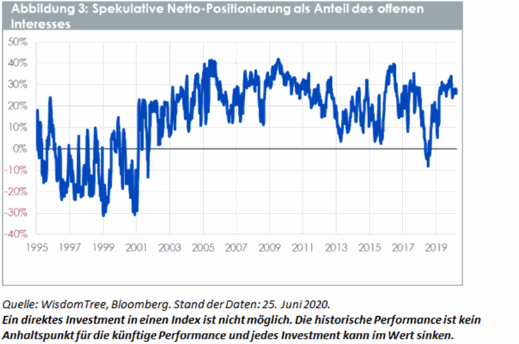 Im Februar 2020 sei das offene Interesse an Gold-Futures ebenfalls hoch gewesen, weshalb diese bereinigte Reihe etwas unterhalb der Rohdaten für die Netto-Positionierung gelegen habe. Gleichermaßen sei der seitherige Rückgang bei der spekulativen Netto-Positionierung zeitlich ebenfalls mit einem rückläufigen offenen Interesse zusammengefallen. WisdomTree schreibt den Rückgang beim offenen Interesse den Verwerfungen auf den Gold-Futures-Märkten zu, die durch die COVID-19-Krise ausgelöst worden seien.