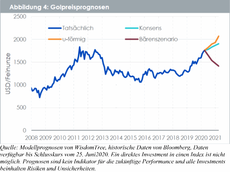 Mithilfe eines Modellrahmens, mit dem WisdomTree die Edelmetalle bewertet, hat der Vermögensverwalter einige Szenarien für die Goldpreise bis ins zweite Quartal 2021 ausgearbeitet.