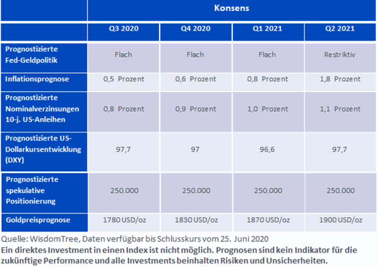 Dies werde einen Anstieg der Fed Fund Rates bis zum zweiten Quartal 2021 von 0,25 Prozent auf 0,3 Prozent bedeuten. Dadurch würden die Treasury-Renditen voraussichtlich ansteigen und bei Gold für Gegenwind sorgen. Den Konsenserwartungen zufolge werde die Inflation bis zum Ende des ersten Quartals 2021 unter einem Prozent bleiben und danach deutlich auf 1,8 Prozent steigen, da der Basiseffekt extrem niedriger Energiepreise im Jahr 2020 bei den Berechnungen gegenüber dem Vorjahr für einen Anstieg sorgen werde. In diesem Szenario sieht WisdomTree die Positionierung in Gold-Futures stabil bei 250.000 Kontrakten netto long.