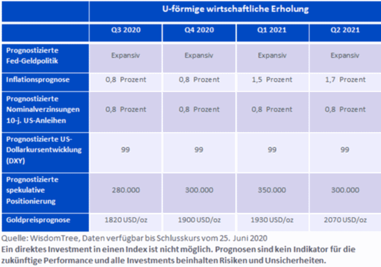 Nach Erachten von WisdomTree wird es in der Weltwirtschaft zu einer u-förmigen Erholung kommen. Nach Ansicht des Vermögensverwalters ist das Ausbleiben einer v-förmigen Erholung der Wirtschaft, während verschiedene Anlagen hohe Gewinne verzeichnen, ein starkes Anzeichen dafür, dass sich wieder Anlageblasen bilden. Obwohl die Finanz- und Währungsbehörden in dieser Krise versucht hätten, neben den Investoren auch vermehrt die Wirtschaft zu begünstigen, sei bei Risikoaktiva eine übermäßige Wertentwicklung zu beobachten gewesen.