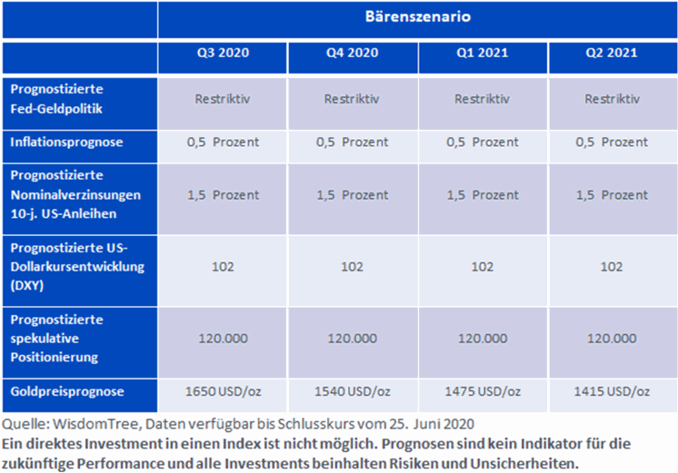 Im Bärenszenario, das WisdomTree für am unwahrscheinlichsten hält, könnten bei Gold die Zuwächse eines Jahres ausgelöscht werden, da die Rückkehr zur geldpolitischen Normalität schnell vonstattengehen würde (und keinen Zusammenbruch der Wirtschaft mit sich bringe).