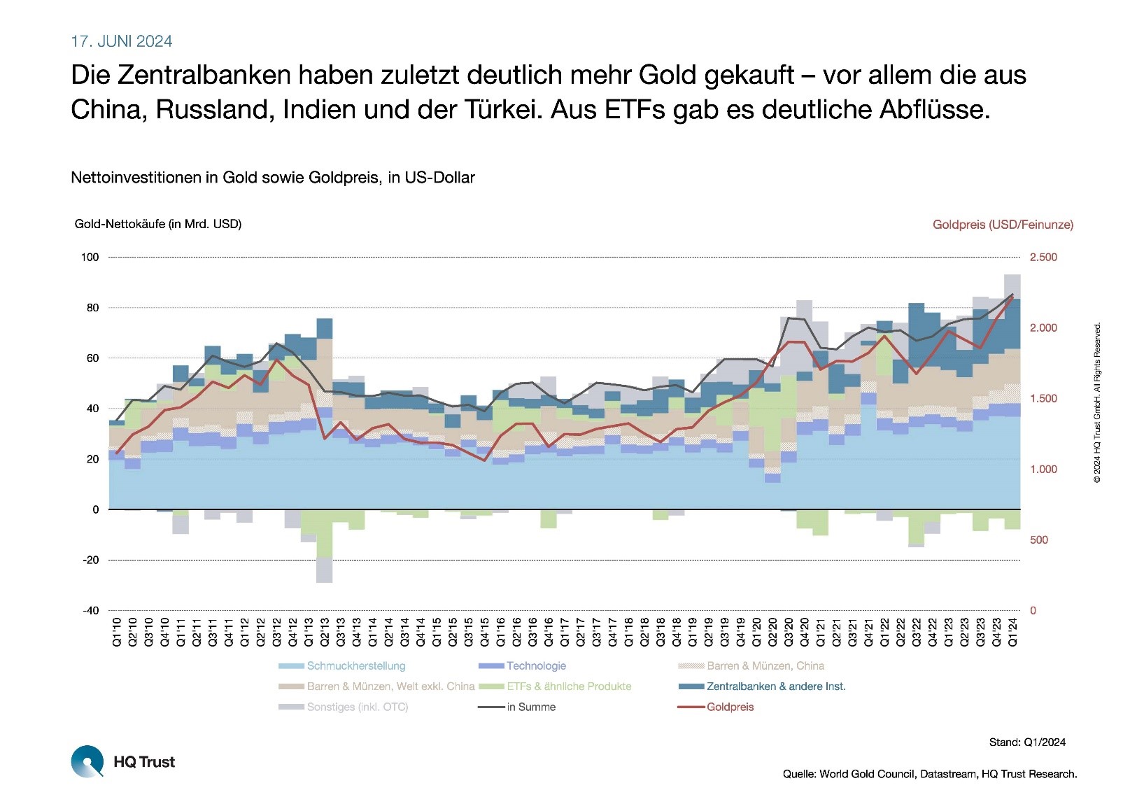 Die Analystin aus dem Bereich Strategische Asset Allokation von HQ Trust untersuchte die Gold-Nettoinvestitionen in Barren und Münzen, ETFs und ähnliche Produkte, die Käufe und Verkäufe der globalen Zentralbanken – aber auch den Anteil, der von der Schmuckindustrie und der Technologiebranche nachgefragt wird.