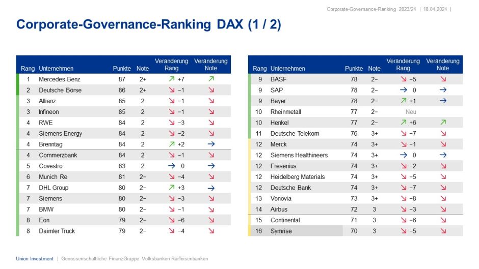 „Das Ranking möchte für die Wichtigkeit des Themas sensibilisieren und Defizite offenlegen“, sagt Carola Schroeder, die das Portfoliomanagement von Union Investment leitet. „Die Unternehmen sollen das Ranking nicht als Kritik, sondern als Ansporn verstehen. Dann wird der Kapitalmarkt zum Motor für gute Unternehmensführung, wovon Unternehmen und Aktionäre gleichermaßen profitieren“, erläutert Schroeder. Sie plädiert dafür, das Thema Corporate Governance nicht isoliert zu betrachten, sondern in einem breiteren ESG-Kontext zu sehen: „Nachhaltigkeit ist fundamental geworden. Wir wollen als Treuhänder die Transformation der Unternehmen zu mehr Nachhaltigkeit aktiv begleiten.“