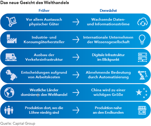 In vielerlei Hinsicht hat sich der Welthandel in den letzten beiden Jahrzehnten bereits grundlegend geändert. Im 20. Jahrhundert war der Handel mit Gütern und Industrierohstoffen enorm gestiegen. Im 21. Jahrhundert stehen die rasche Digitalisierung von Dienstleistungen und die wachsende Automatisierung der Industrie im Vordergrund. Dieser technische Fortschritt ist für die Zukunft internationaler Unternehmen mindestens ebenso wichtig wie politische Verhandlungen.