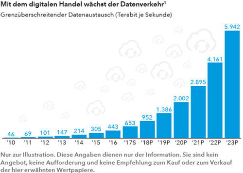 Die klassischen Außenhandels- und Wachstumskennziffern erfassen große Teile der digitalen Wirtschaft nicht. Auch entzieht sie sich oft den alten Handelsverträgen und Zollregimen. Ein Beispiel für Wachstum in diesem Bereich ist der grenzüberschreitende digitale Datenverkehr. Seit 2007 hat er sich vervierzigfacht, und in den nächsten sieben Jahren ist eine weitere Verdreizehnfachung zu erwarten.[1] Handelsverträge dürften für Industrieunternehmen wichtiger sein als für New-Economy-Firmen.
