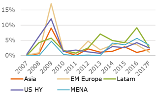 Die Ausfallquoten asiatischer Anleihen sind insgesamt niedrig, da asiatische Unternehmen in der Regel gut geführt werden und die Bilanzen solide sind. Im Jahr 2016 war die Ausfallquote in Asien mit 1 Prozent niedriger als in anderen Schwellenländerregionen und den USA.