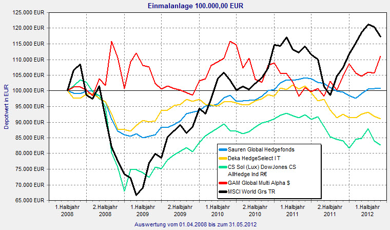 FundResearch hat die vier größten, in Deutschland gelisteten, Dach-Hedgefonds (gemessen am Fondsvolumen) im Zeitraum der vergangenen drei Jahre miteinander verglichen: „Sauren Global Hedgefonds“ von IPConcept Fund Management (81,28 Millionen Euro), „Deka HedgeSelect“ von Deka Investment (50,75 Millionen Euro), „CS Sol CS (Lux) DowJones AllHedge“ von Credit Suisse (45,28 Millionen Euro) und „GAM Global Multi Alpha“ von der GAM Fund Management (44,63 Millionen Euro).