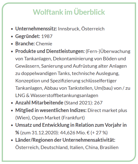 Der Börsengang der Tankanlagenspezialist:innen Anfang 2019 und das Listing in Wien und München sorgte für frisches Kapital, um die Internationalisierung fortzuschreiben und eröffnete dem Mittelständler ein großes Netzwerk. Wolftank will die treibende Kraft in seiner Nische sein, Innovation und Nachhaltigkeit auf einen Nenner bringen sowie technologisch und vertrieblich Maßstäbe setzen. Um den Vorsprung zu halten werden Firmen und Technologien gekauft und weiterentwickelt sowie neue Geschäftsfelder erschlossen. Der Bau von Flüssig-Erdgas (LNG) Tankstellen gehört dazu und gewinnt im Zuge der Verkehrswende an Bedeutung. Dr. Werth ist davon überzeugt, dass nicht der Elektromotor, sondern flüssiges Methan (Liquefied Natural Gas) das kommende Hauptantriebsmittel für LKW und Schiffe sein wird. Die LNG-Struktur für LKW wird weiter ausgebaut und von der EU gefördert. Wolftank selbst hat bereits seit 2007 entsprechende LNG-Baupläne in der Schublade.