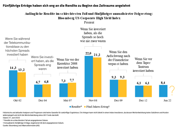 Darüber hinaus hat die Vergangenheit gezeigt, dass die Rendite im schlechtesten Fall des US-Hochzinssektors ein hervorragender Indikator für die in den folgenden fünf Jahren erzielten Erträge war. Die Wertentwicklung von US-Hochzinsanleihen war dadurch sogar in schwierigen Marktphasen vorhersehbar (Abbildung).