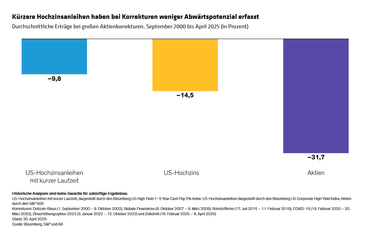 Hochzinsanleihen mit kurzer Laufzeit können in Zeiten hoher Marktvolatilität ihre Stärken unter Beweis stellen. Während früherer Korrekturen an den Aktienmärkten erzielten kurzfristige US-Hochzinsanleihen im Durchschnitt rund drei Viertel des Drawdowns traditioneller Hochzinsanleihen und weniger als die Hälfte des Drawdowns von Aktien (Abbildung).