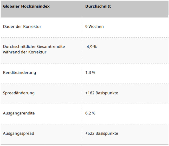 4 Die Daten beziehen sich auf den Barclays Global High Yield ex-CMBS ex-EMG 2% Issuer Capped Bond Index, USD Hedged. Hinweis: „Spread“ ist der optionsbereinigte Spread (OAS) und „Rendite“ ist die Yield-to-Worst. Die Analyse und die Durchschnittswerte umfassen die zehn Korrekturen am Hochzinsmarkt zwischen Anfang 2010 und 2016. Diese zehn Marktkorrekturen ereigneten sich in den folgenden Zeiträumen: 12. Jan. 2010 – 16. Feb. 2010, 27. Apr. 2010 – 11. Juni 2010, 10. Nov. 2010 – 30. Nov. 2010, 29. Juli 2011 – 4. Okt. 2011, 31. Okt. 2011 – 24. Nov. 2011, 4. Mai 2012 – 5. Juni 2012, 9. Mai 2013 – 25. Juni 2013, 29. Aug. 2014 – 16. Dez. 2014, 29. Mai 2015 – 29. Sep. 2015 und 4. Nov. 2015 – 11. Feb. 2016.