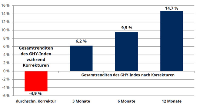 Durchschnittliche Gesamtrenditen des globalen Hochzinsindex (GHY-Index)* in den darauffolgenden drei, sechs und zwölf Monaten