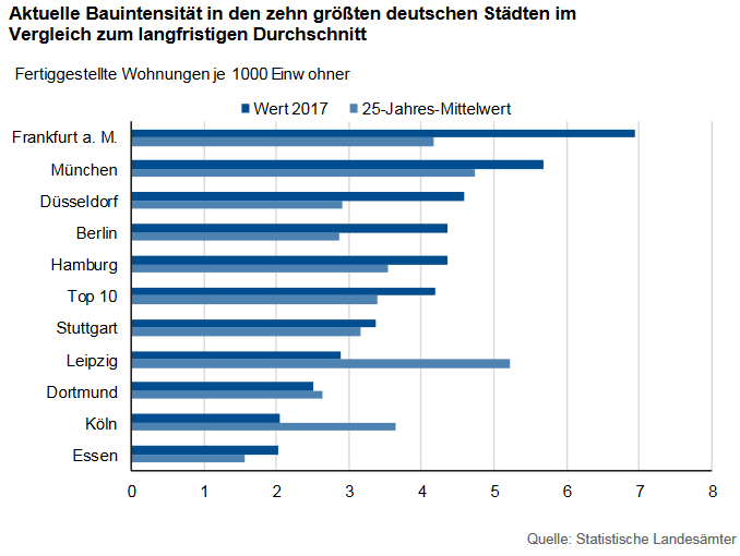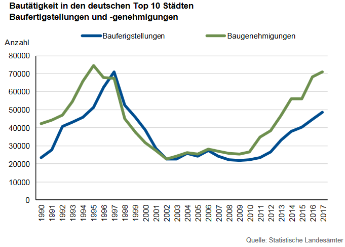 Welche Dynamik im Markt steckt, lässt sich derzeit gut am sogenannten Bauüberhang zeigen: 150.000 Wohnungen sind in den zehn größten Städten derzeit genehmigt, aber noch nicht fertiggestellt worden. Zwei Drittel des Bauüberhangs befindet sich bereits im Bau. Das bedeutet, dass rund 100.000 Wohnungen in den kommenden ein bis zwei Jahren fertiggestellt und neu auf den Markt kommen werden.