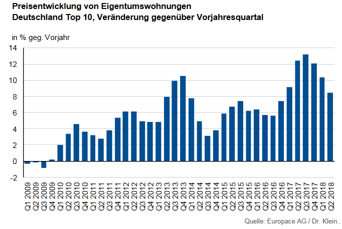 Der Immobilienmarkt boomt nach wie vor. Im ersten Halbjahr 2018 sind die Preise für Eigentumswohnungen in den größten deutschen Städten im Durchschnitt um mehr als acht Prozent im Vergleich zum Vorjahr gestiegen. Damit liegen die Preiszuwächse nach wie vor signifikant über Inflation und Langfrist-Trend.