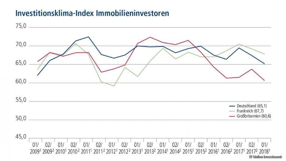 Der Immobilien-Investitionsklimaindex von Union Investment wird seit 2005 (seit Frühjahr 2008 halbjährlich) unter den europäischen Immobilien-Investoren ermittelt. Der Index berechnet sich aus den vier Teilindikatoren „Marktstruktur“, „Rahmenbedingungen“, „Standortbedingungen“ und „Erwartungen“, die mit jeweils 25 Prozent gewichtet werden. Für den Index befragte das Marktforschungsinstitut Ipsos im Zeitraum Mai bis Juli 2018 insgesamt 163 Immobilienunternehmen und institutionelle Immobilienanleger in Deutschland, Frankreich und Großbritannien.