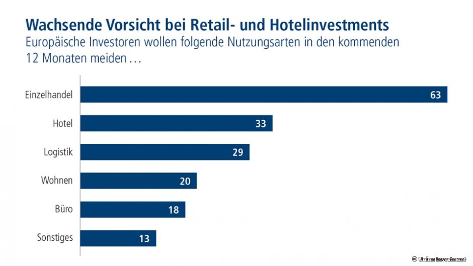 Bei den Vermeidungsstrategien rangieren Investments in Einzelhandelsobjekte derzeit ganz oben. 63 Prozent der befragten Investoren wollen in den nächsten zwölf Monaten einen Bogen um Einzelhandelsinvestments machen. Der Umfragewert ist stark beeinflusst von der derzeit tiefen Abneigung britischer Akteure gegen Investitionen im Einzelhandel: 82 Prozent versuchen hier Investitionen kurzfristig zu umzugehen. In Frankreich liegt der Wert bei ebenfalls hohen 70 Prozent. Demgegenüber herrscht in Deutschland mit einer Vermeidungsquote von 40 Prozent noch vergleichsweise hohes Zutrauen in den heimischen Retailmarkt.