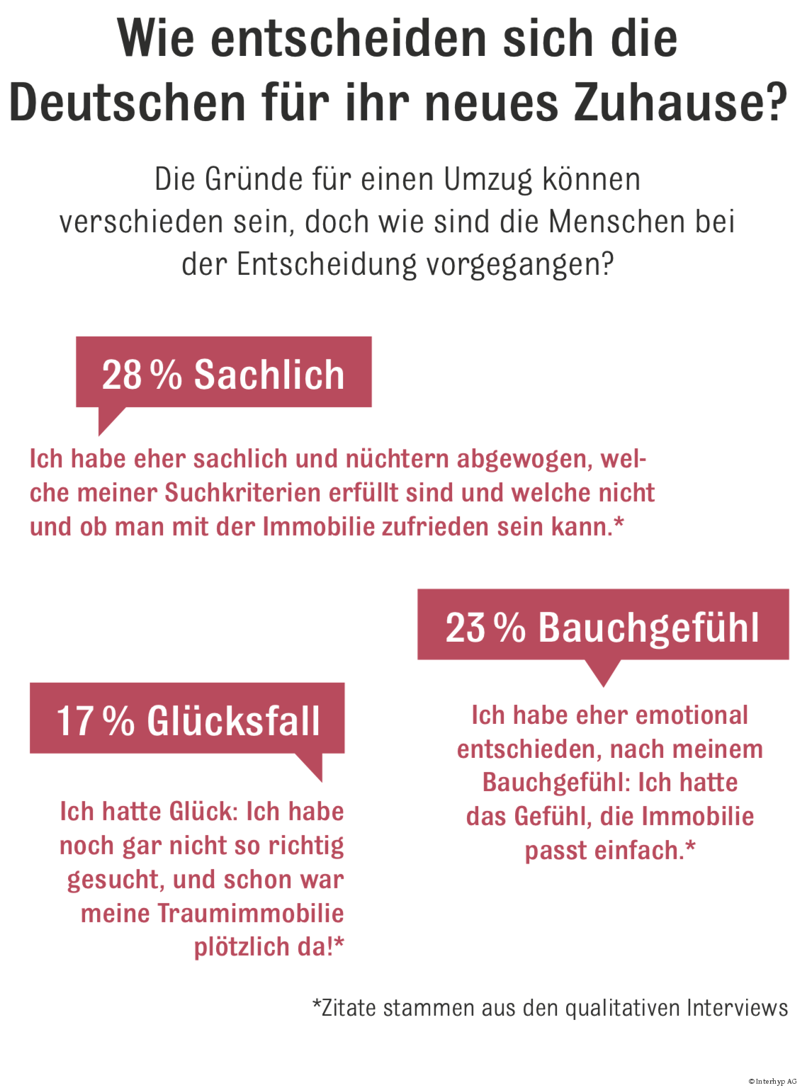 Obwohl Wohneigentum auch 2019 als elementarer Baustein der Vermögensbildung und Altersvorsorge und als eine Entscheidung für das gesamte Leben betrachtet wird, haben sich 23 Prozent der Menschen aus dem Bauch heraus für ihre Immobilie entschieden. 17 Prozent bezeichnen ihren Immobilienkauf als Glücksfall.