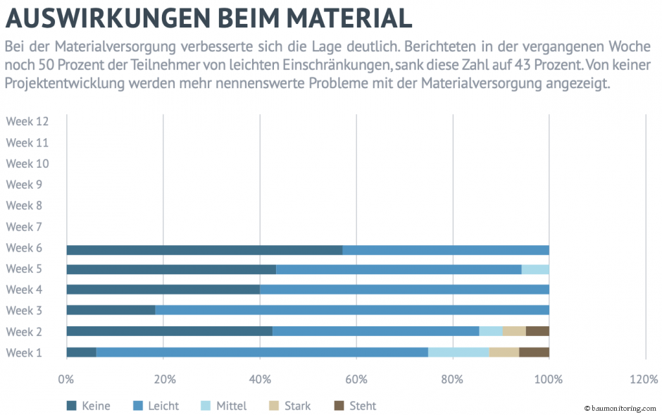 Auch bei der Materialversorgung verbessert sich offensichtlich die Lage. In der aktuellen Erhebung erkennen 57 Prozent der Teilnehmer keine Einschränkungen (Vorwoche 44 Prozent). Während in dieser Woche 43 Prozent der Befragten noch leichte Einschränkungen bei der Materialversorgung sehen, sagten dies in der Vorwoche 50 Prozent. Mittlere (Vorwoche noch 6 Prozent) oder große Einschränkungen, gar Stillstand auf der Baustelle beobachtet zurzeit niemand.