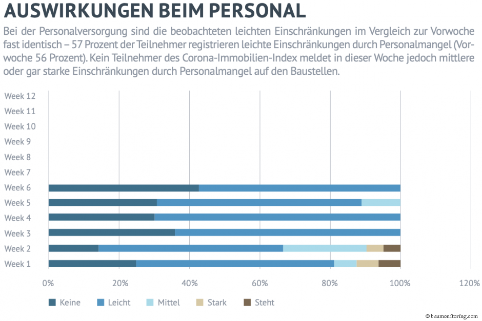 Bei der Personalversorgung melden 43 Prozent (Vorwoche 31 Prozent) keinerlei Einschränkungen. 57 Prozent der Teilnehmer registrieren leichte Probleme durch Personalmangel (Vorwoche 56 Prozent). Niemand jedoch meldet in dieser Woche mittlere Einschränkungen durch Personalmangel auf den Baustellen (Vorwoche 13 Prozent). Auch starke Probleme oder Stillstand, wie in den ersten Wochen nach dem Corona-Lockdown kommen nicht mehr vor.